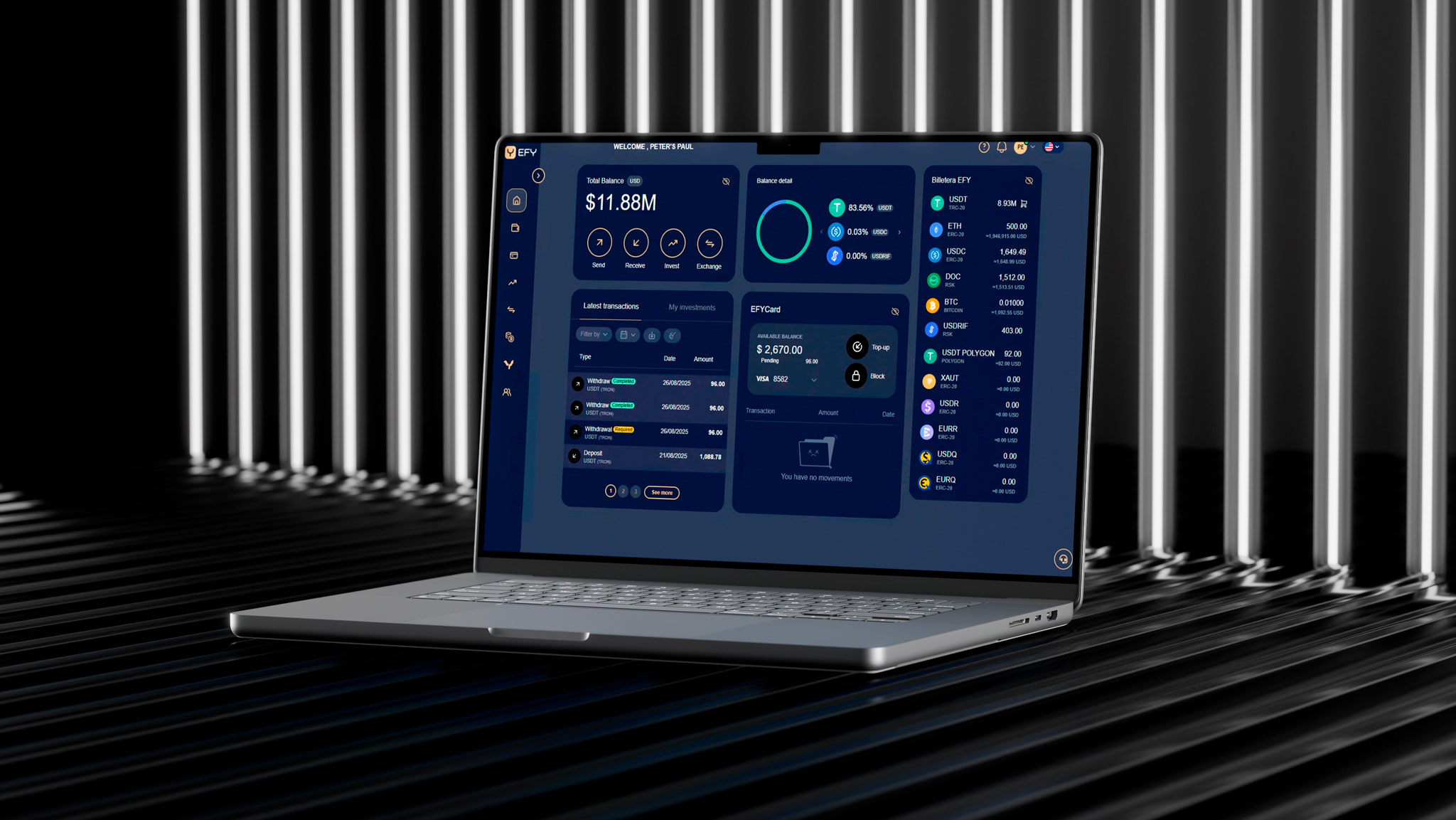 EFY integra servicios financieros en una sola plataforma, incluyendo operaciones en múltiples monedas. La conversión se realiza dentro del ecosistema, permitiendo a los usuarios operar en distintas divisas según sus necesidades.